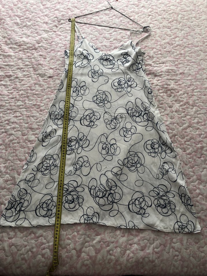 Kolsuz, bohem tarzda beyaz midi elbise. V yaka ve baskılı fırfır detaylarıyla şık ve vücuda oturan kesim. Düğün için uygun.
