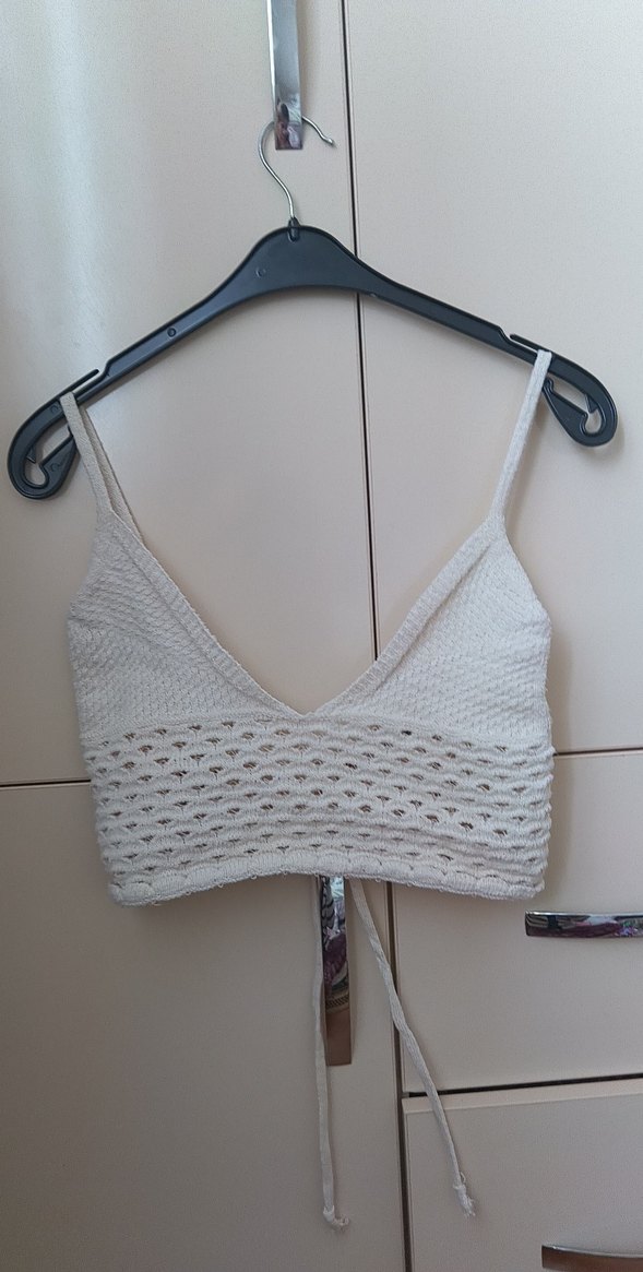 Gri tonlarında beyaz mini bralet, kısa boy ve bohem tarzda örgü dokusu ile ince askılara sahip rahat bir modeldir.