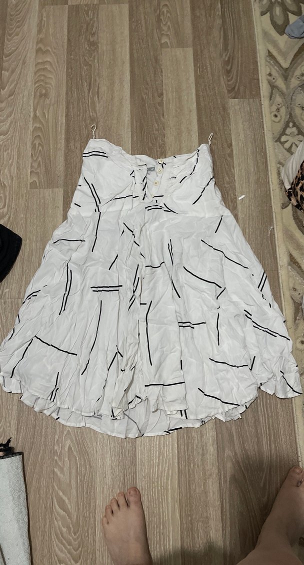 Bohem tarzda, beyaz keten kumaştan yapılmış, bol kesim ve gri fırfır detaylı mini etek, açık hava kullanımı için uygun.