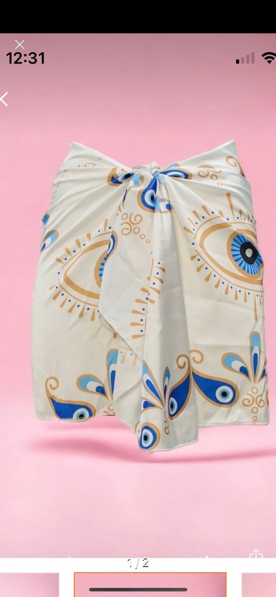 Bohem tarzda, beyaz mini pareo. Bağlamalı, dökümlü ve bol kesim. Göz desenli, kısa boylu, ince askılı ve günlük kullanıma uygun.