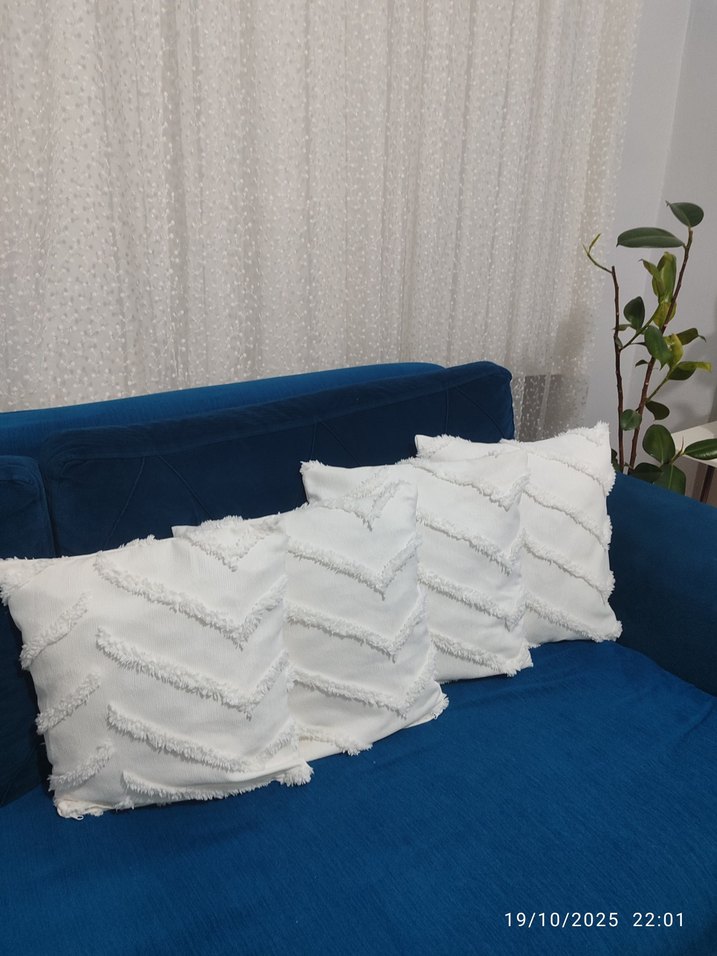 Beyaz bohem nakışlı yastık kılıfları, kanepenize hafif ve dokulu bir görünüm kazandırır.