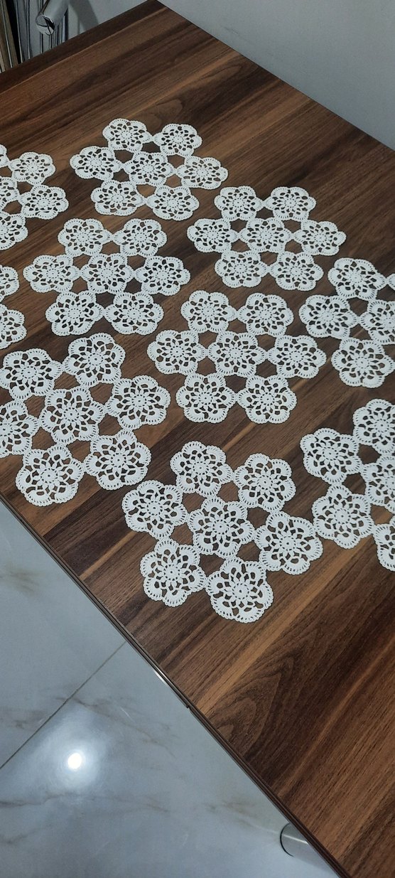Bohem tarzda beyaz nakışlı, el yapımı çiçek desenli masa örtüsü. Her masaya zarif bir dokunuş katar.