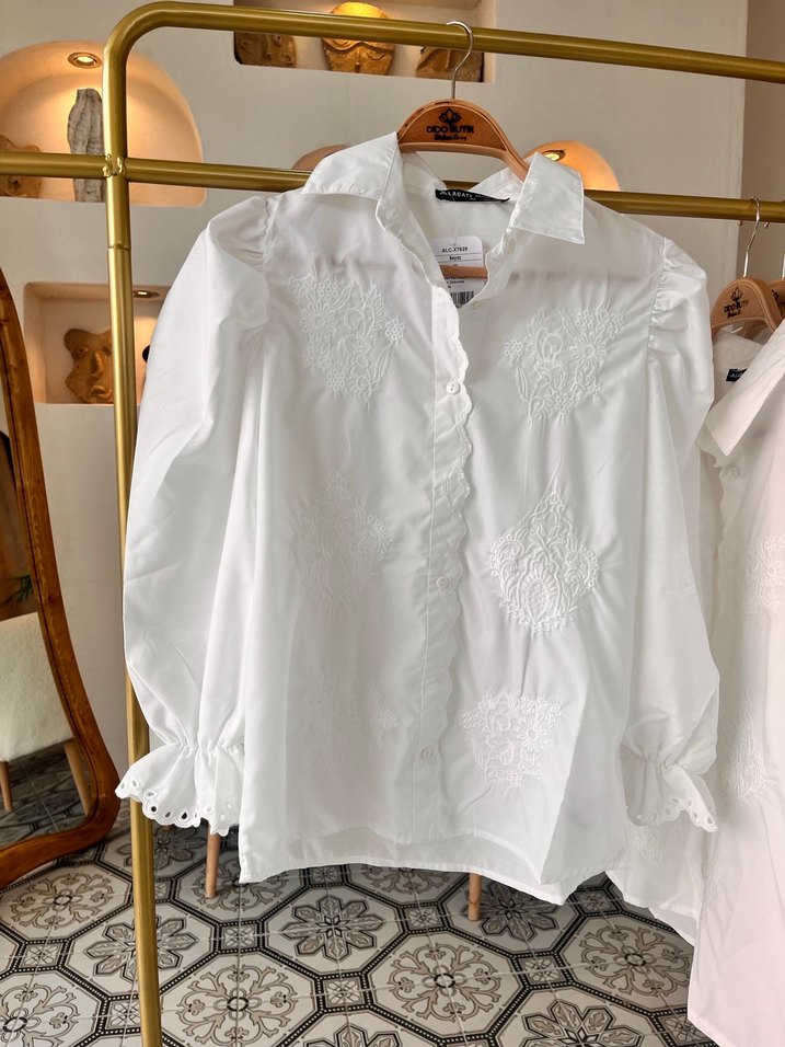 Pamuk kumaştan, nakışlı uzun kollu beyaz gömlek. Yaka ve düğmeli ön kısmı ile rahat bohem tarzı sunar. Ofis için uygun, bol kesim.