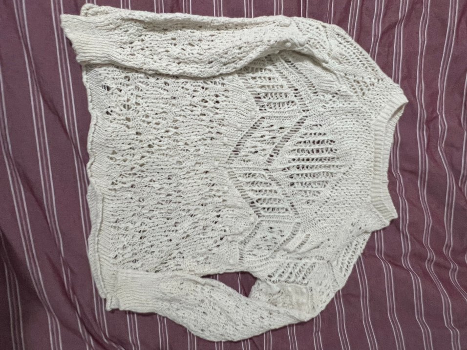Bohem tarzda, beyaz örgü kadın kazak. Uzun kollu, salaş kesim ve tekne yaka ile günlük kullanıma uygun, yumuşak ve hafif dokulu.