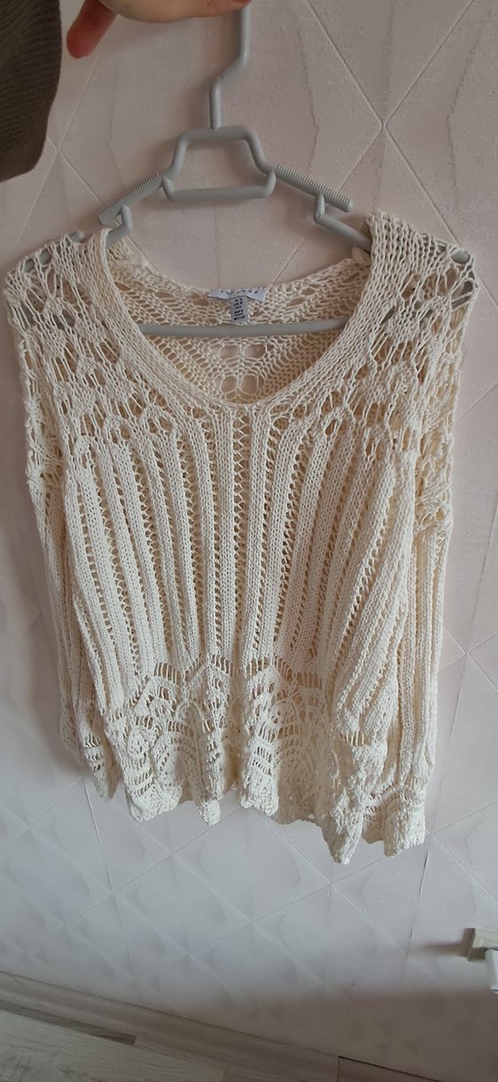 Bohem tarzda, beyaz renkli, kolsuz ve yuvarlak yaka, gevşek kesim örgü kadın kazak. Günlük kullanıma uygun.