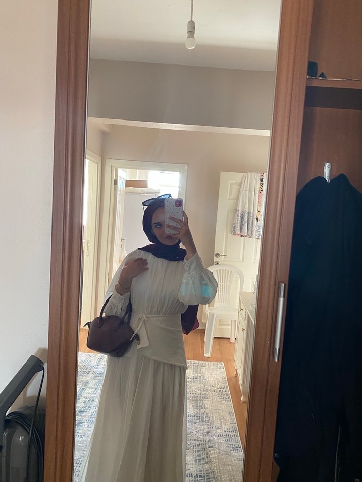 Pamuklu, beyaz uzun elbise yüksek yakalı, salaş kesim ve drapeli detaylara sahip. Askılı kolları ve mütevazı, bohem tarzıyla günlük kullanıma uygundur. Sadece mezuniyet için 1 defa giyildi