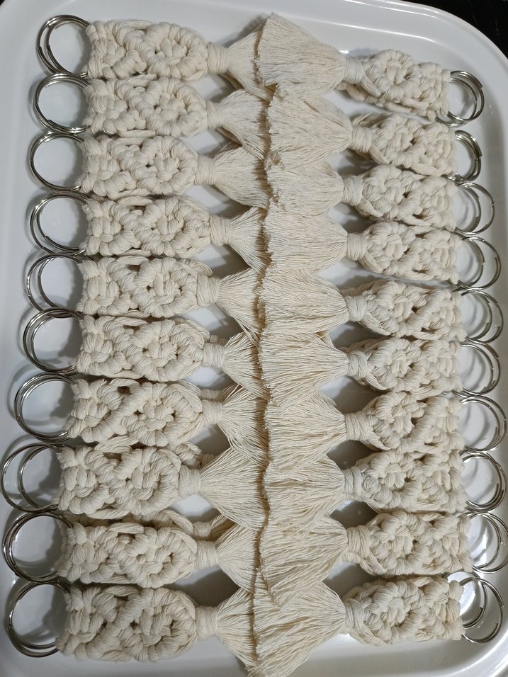 Bohem tarzda beyaz püsküllü anahtarlıklar, örgü detaylı ve metal halka ile kullanışlıdır. Retro ve hippie tarzına uygundur. marka temsilidir.