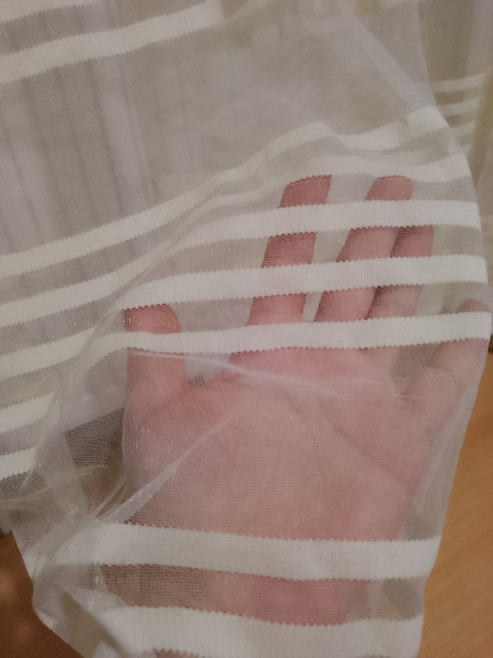 Bohem tarzda, hafif beyaz renkli, yatay şerit detaylı yarı saydam tül perde.