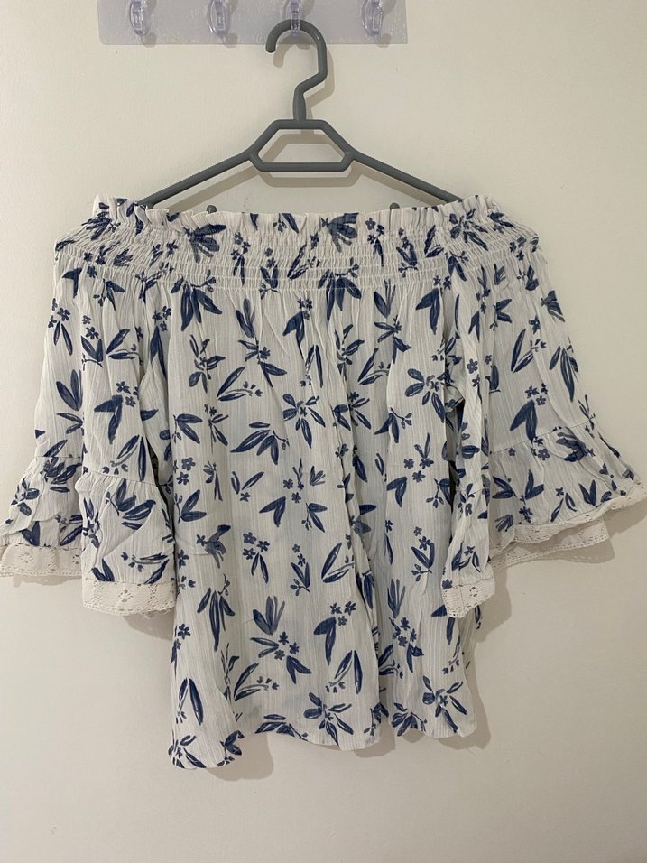 Bohem tarzda, straplez yaka ve kısa kollu, bol kesim beyaz bluz. Mavi çiçek desenli, fırfır detaylı ve yumuşak sentetik kumaştan üretilmiştir.