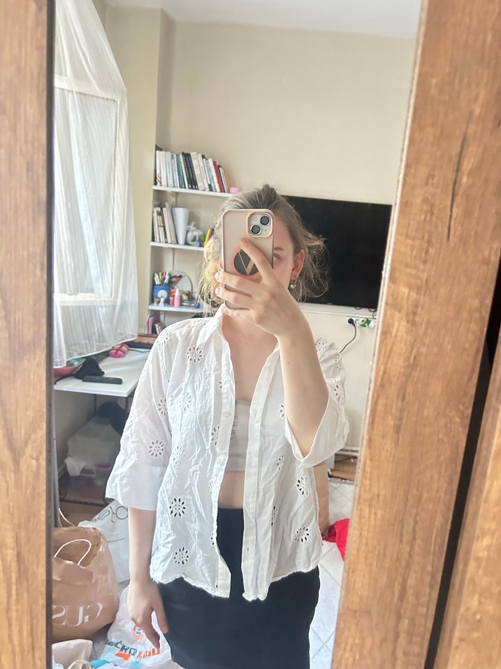Bohem tarzda, yakalı, kısa kollu, pamuklu ve transparan kumaştan yapılmış, bol kesim beyaz gömlek, midi boyda.