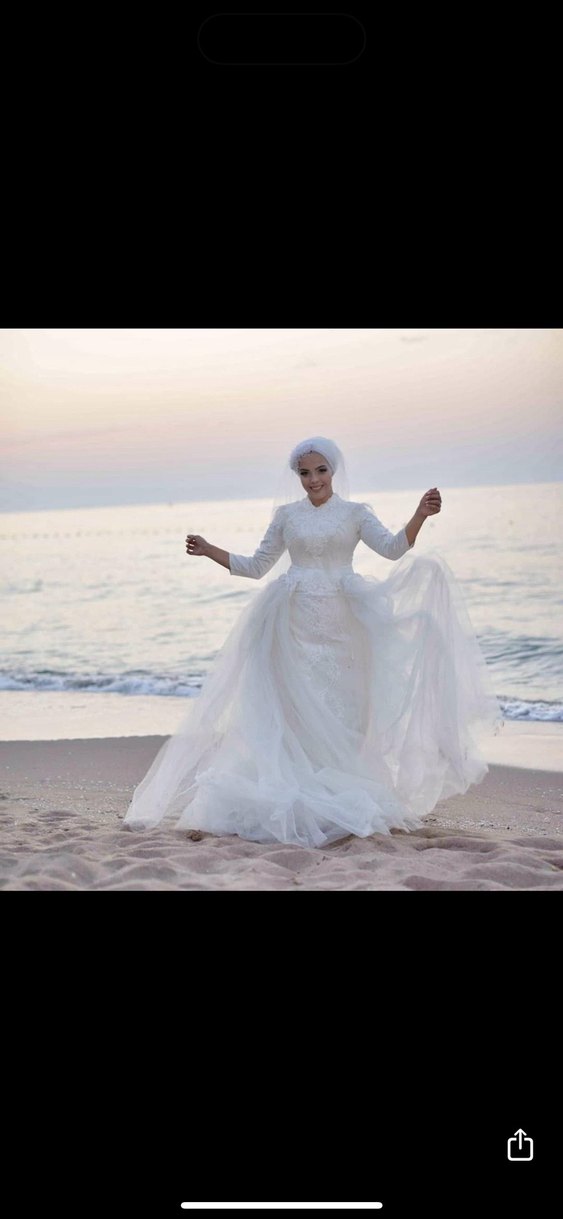 Uzun kollu ve yüksek yakalı beyaz denizkızı gelinlik, bohem tarzda, bol kesim ve hafif kumaşla sade bir şıklık sunar.