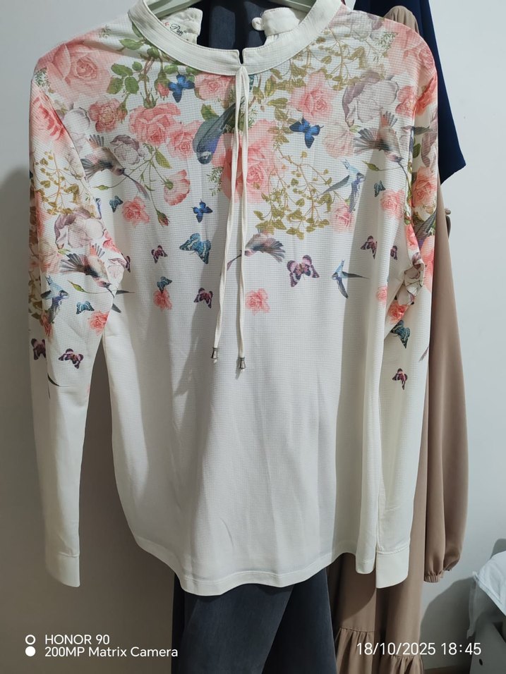Beyaz renkte, uzun kollu ve yüksek yakalı, bol kesim bohem desenli bluz. günlük kullanıma uygundur.