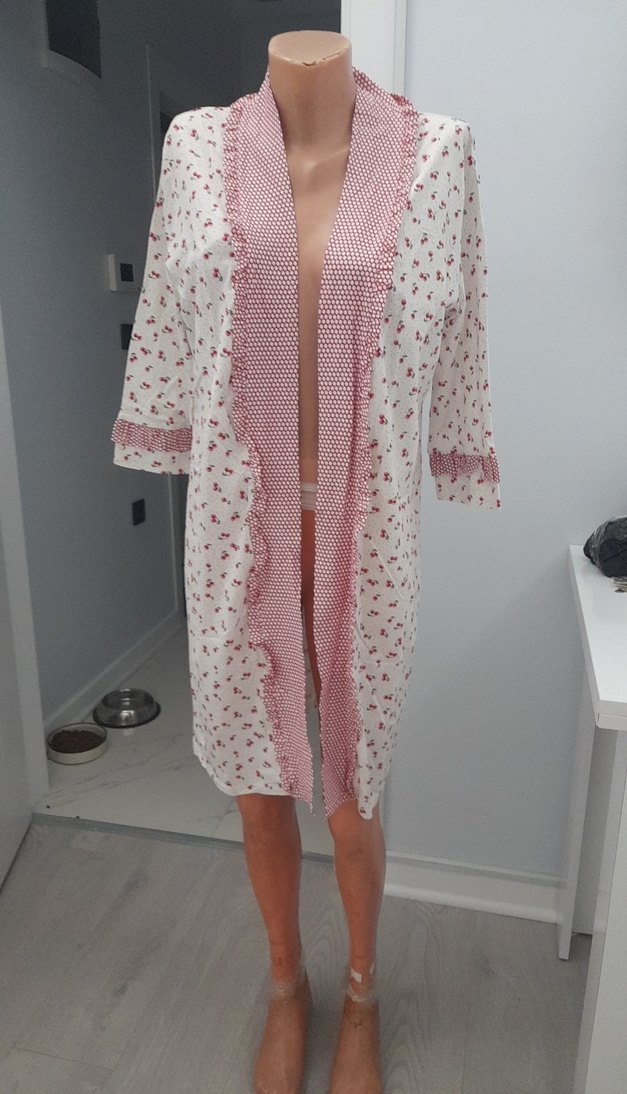 Bohem tarzda, uzun kollu ve bol kesim beyaz, desenli kadın sabahlik Uzun boylu ve kontrast detaylıdır.
