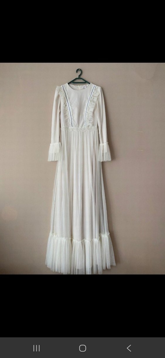 Pamuklu, uzun kollu, V yakalı, işlemeli ve fırfırlı beyaz uzun bohem elbise. Rahat kesimiyle düğün için uygundur.