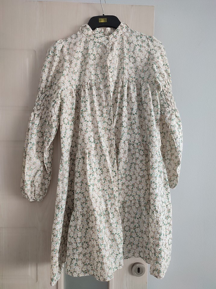 Yumuşak keten kumaştan, düğmeli, uzun kollu ve yüksek yakalı bohem tarzı hamile tuniği. Gevşek kesim ve pastel çiçek desenli, günlük kullanıma uygun.
