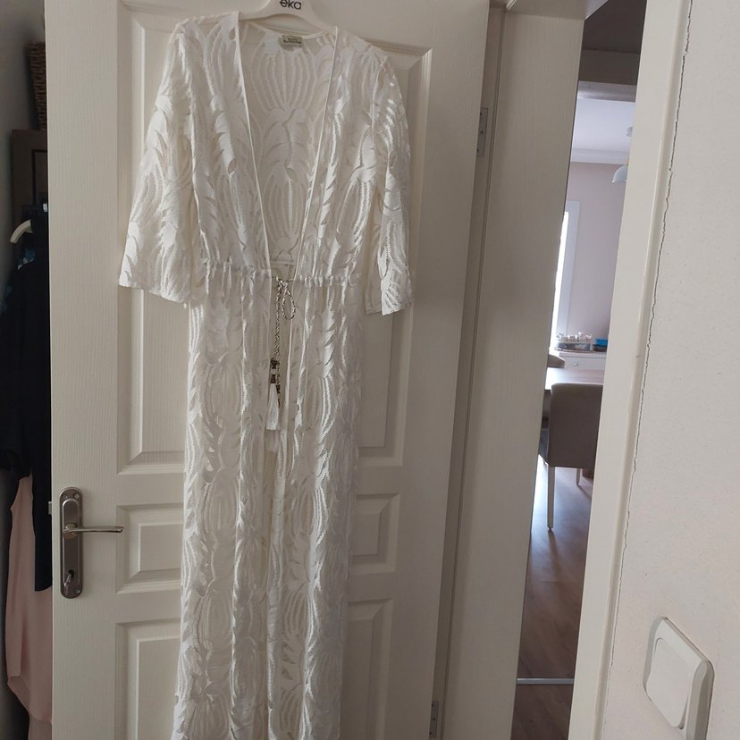 Bu beyaz bohem uzun elbise nakışlı desenlere ve dantel detaylara sahiptir. V yakalı, askılı kolları ve bol kesimiyle yumuşak sentetik kumaştan üretilmiştir.
