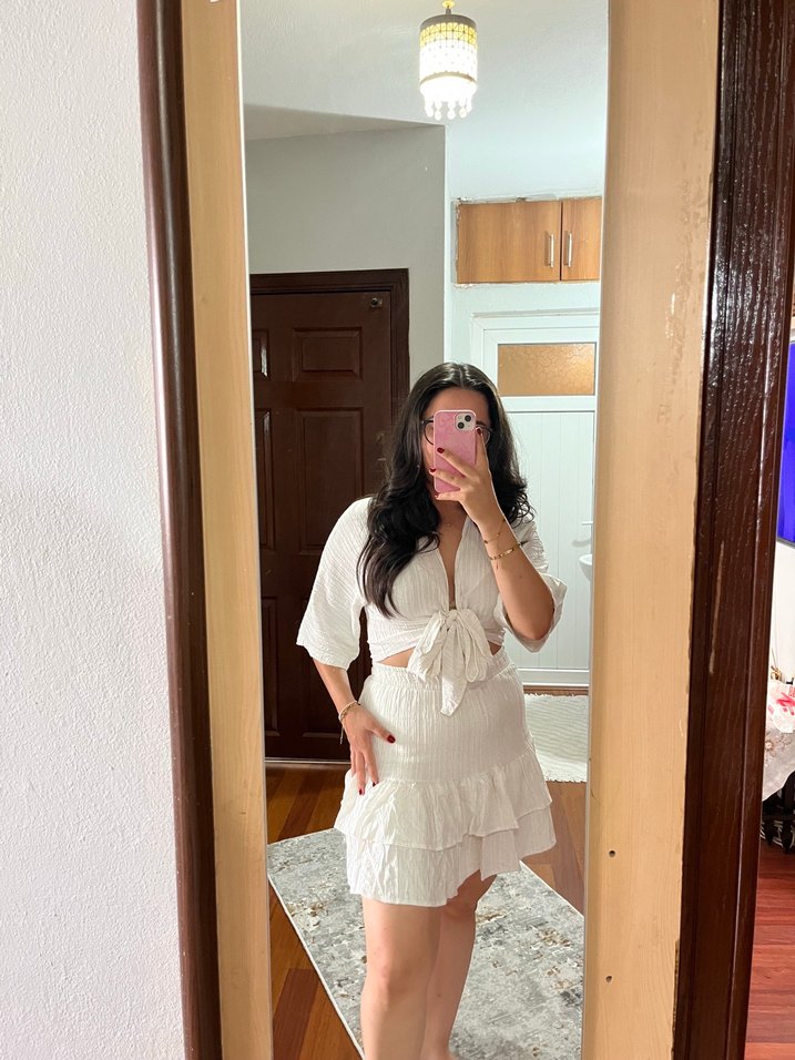 Pamuk kumaştan, V yakalı ve kısa kollu, bohem tarzda beyaz ekru takım . Hafif ve desen içermeyen tasarımıyla romantik akşamlar için zahmetsiz şıklık sunar.