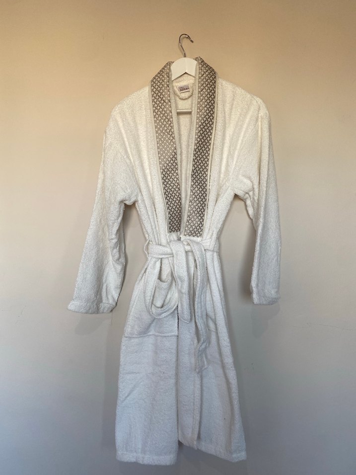 Bohem tarzda, yaka desenli beyaz bornoz. Uzun kollu ve belden bağlamalıdır.