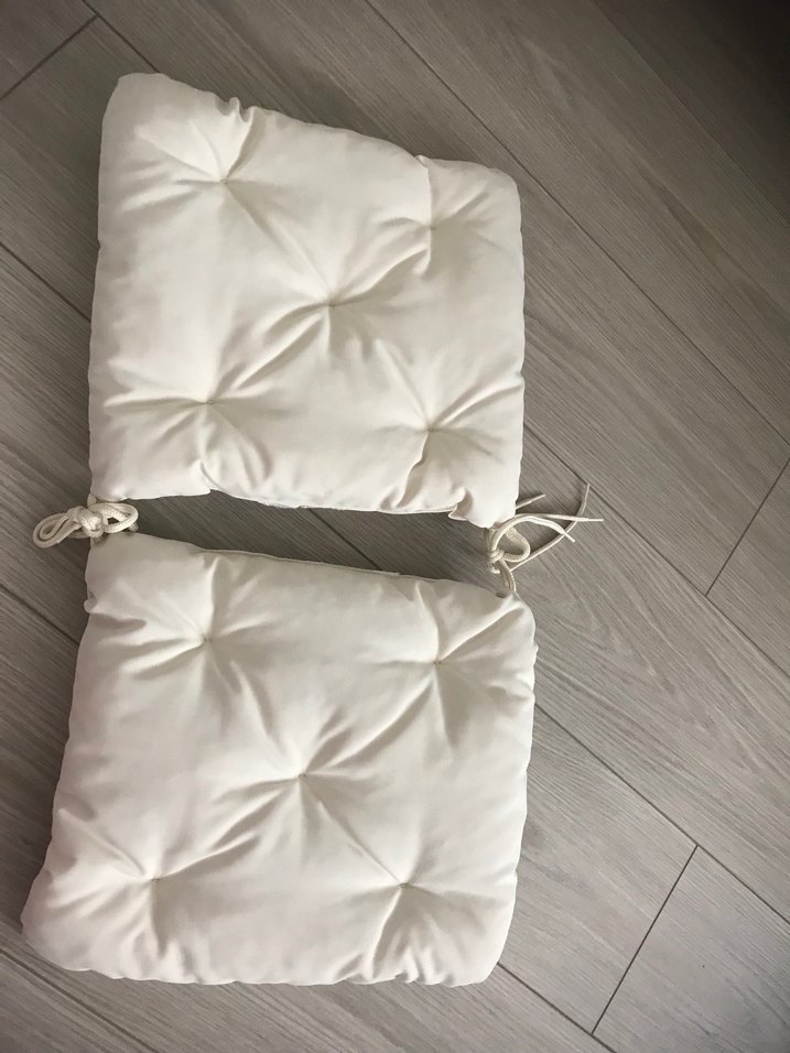 Bağlamalı, bohem tarzda kirem rwngi yumuşak sandalye minderleri. Düz ve konforlu oturma sağlar