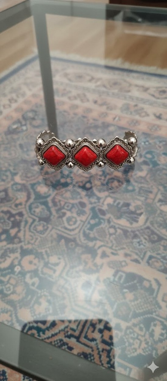 . ️Taşlar: Canlı kırmızı renkte, mermerimsi damarlı bir dokuya sahip (muhtemelen sentetik turkuaz/howlite boyaması veya akrilik). Kare ("cushion cut" benzeri) şeklinde tasarlanmışlar. Metal İşçiliği: Taşların etrafı kabartmalı, boncuk benzeri metal küreler ve tırtıklı kenarlarla çevrelenmiş. Bu tarz genellikle Bohem (Boho) veya Batı/Etnik (Western) takı tasarımlarında görülür. Yapı: Bileklik muhtemelen geniş bir kelepçe veya esnek (lastikli) bir yapıya sahip. Metalin parlaklığı yeni veya iyi korunmuş olduğunu gösteriyor. Arka Plan: Nesne, geleneksel motifli bir dokuma üzerinde duruyor; bu da ürünün otantik havasını pekiştirmiş.Ürünler sıfır ücret politikamda onun için böyle lütfen onu göz önüne alın..