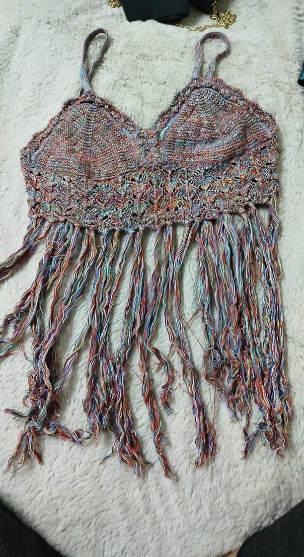 Bohem tarzı çok renkli, uzun püsküllü örgü kadın bluz hiç giyilmedi herhangi bir sorunu yok hippie bohem tarzı