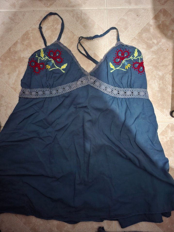 Nakışlı çiçek detayları ve ayarlanabilir askılı,yandan fermuarlı,çok şık ve tertemiz bir ürün, indigo mavi, boy(askı hariç)50cm,koltuk altından koltuk altına 41cm,hiç esnemiyor