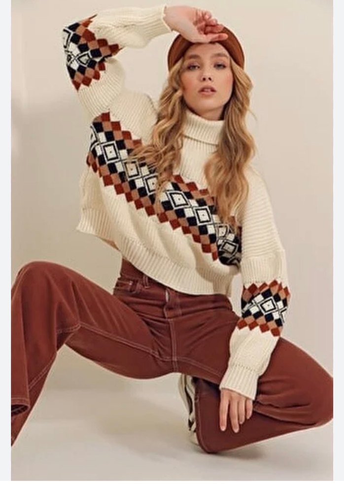 Boğazlı, uzun kollu, bol kesim örgü kadın kazak. Koyu kahverengi tie-dye desenli, bohem tarzda rahat bir parça.