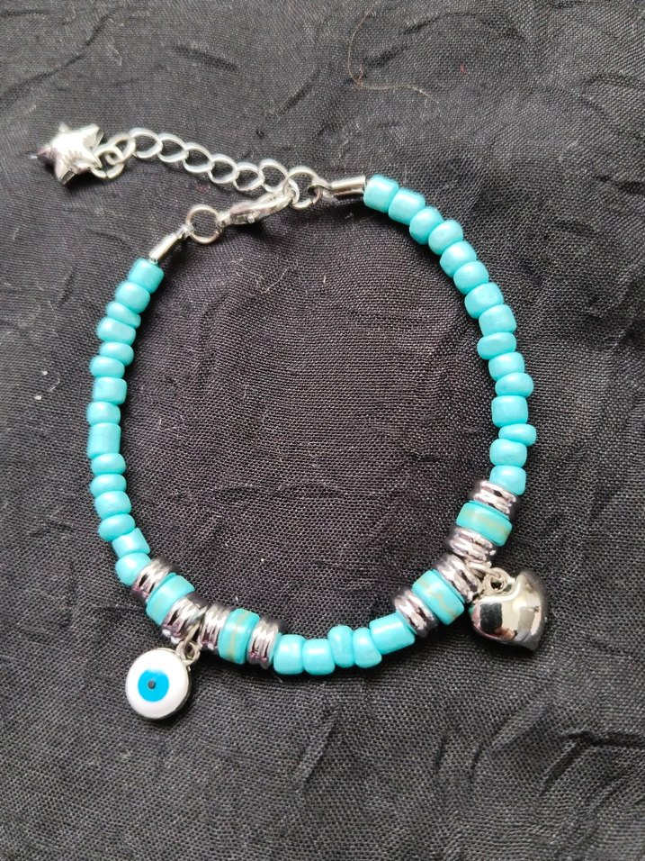 Bohem tarzı, turkuaz boncuklar ve işleme desenlerle süslü, nazar boncuklu ve kalpli aksesuar detaylı bileklik. Günlük kullanım için uygundur.