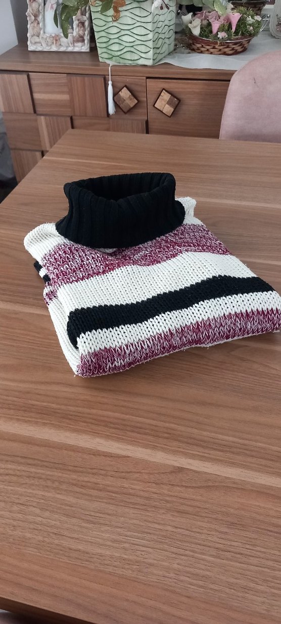 Bohem tarzda, balıkçı yaka ve uzun kollu, örgü kumaştan yapılmış bordo tonlarında kadın kazak. Rahat kesimi ve şık çizgileriyle günlük kullanıma uygundur.