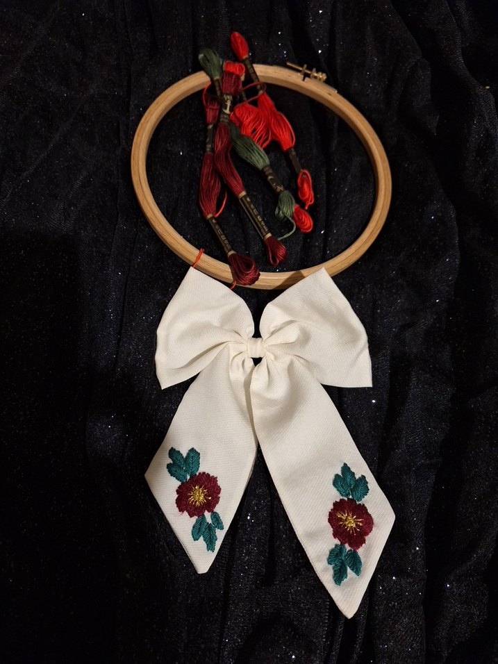 Bordo renkte, nakış detaylı kumaş fiyonk saç aksesuarı. Bohem tarzda, vintage dokunuşlarla dikkat çeker.