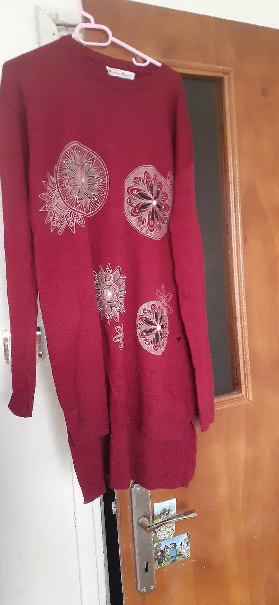 Bordo renkli, uzun kollu, yuvarlak yaka ve nakışlı desenlere sahip hamile kazak tanık . Gevşek kesim ve uzun boyuyla rahat ve bohem tarz sunar.