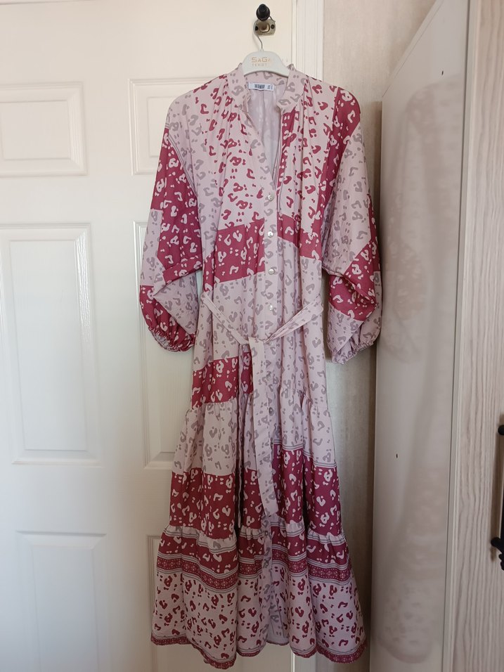 Bol kesim, uzun kollu, V yaka ve drapeli tasarıma sahip, açık bordo tonlarında batik desenli uzun elbise, günlük kullanım için uygundur. bir kez kullanılmıştır,faya butikten alınmıştır