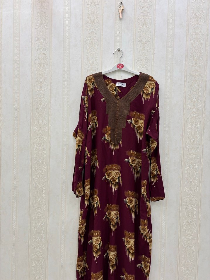 Bordo renkli, V yakalı ve uzun kollu, bol kesim uzun elbise. Renkli batik desenli ve düğmeli, sentetik kumaştan yapılmıştır. Yurt dışı ürünüdür görseldekinin aynısı