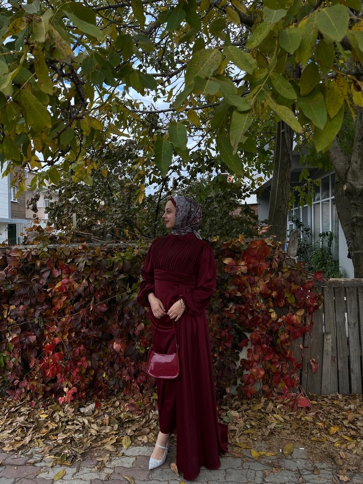 Bordo uzun elbise, yüksek yaka ve uzun kolludur. Hafif dökümlü ve bol kesimdir. Yumuşak sentetik kumaştan, bağlama desenlidir. Bohem ve modest tarzda, düğün için uygundur.