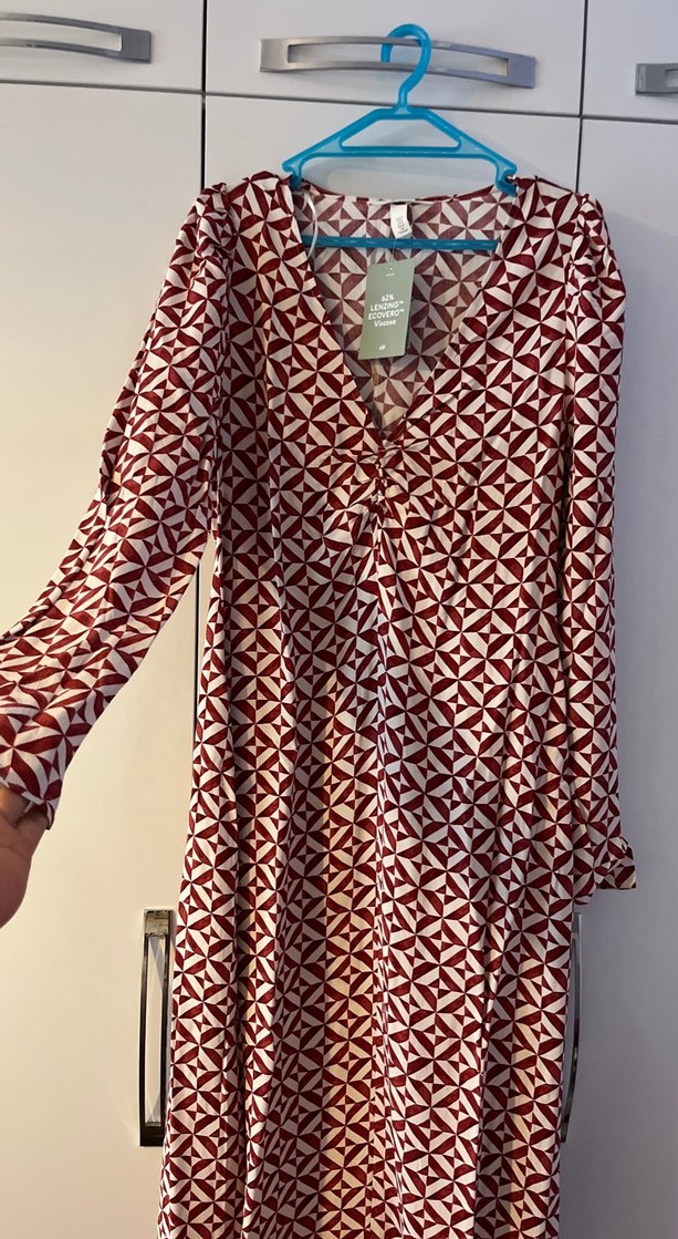 Bordo renkli, uzun kollu, V yakalı, düğmeli ve bol kesim. Hafif batik desenli, yumuşak sentetik kumaştan, günlük kullanım için uygundur. Yurtdışından alınma yeni etiketli .