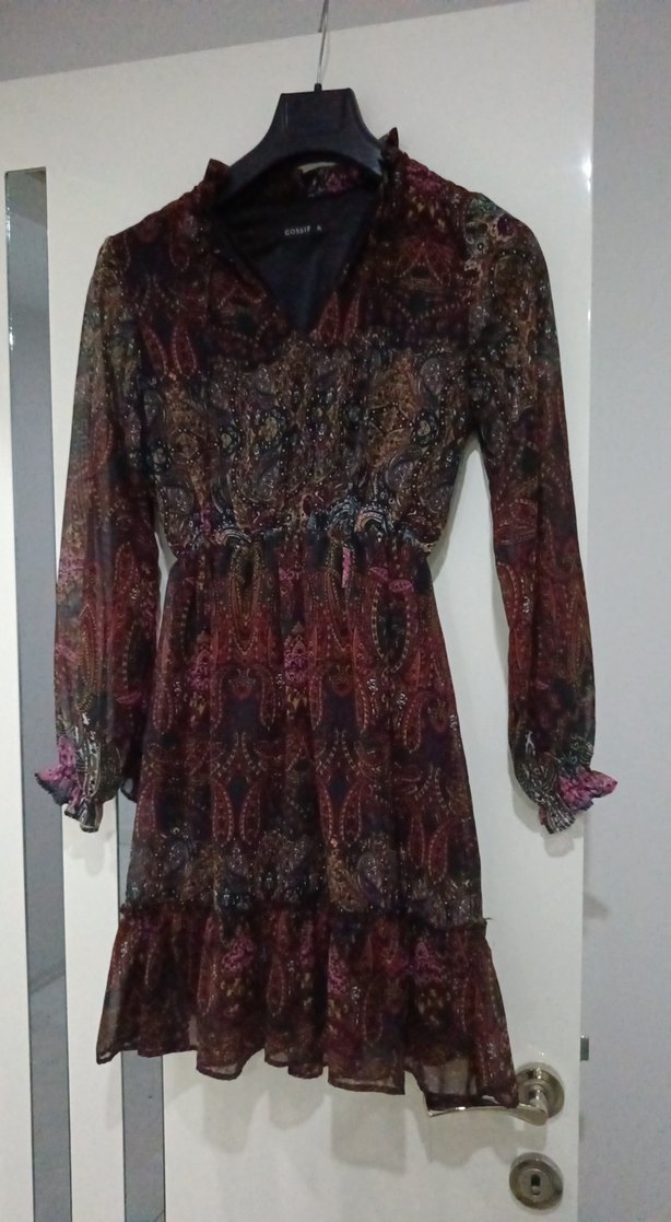 Bohem tarzda, uzun kollu ve yüksek yakalı bol kesim elbise. Koyu bordo batik desenli ve fırfır detaylı, romantik akşamlar için uygun.