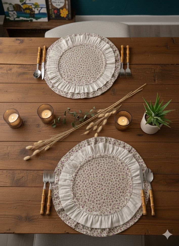 Bohem tarzda, açık çiçek desenli ve fırfırlı kenarları olan bej amerikan servisler, masanıza şıklık katar. Ham keten kuma ve poplin kumaştir