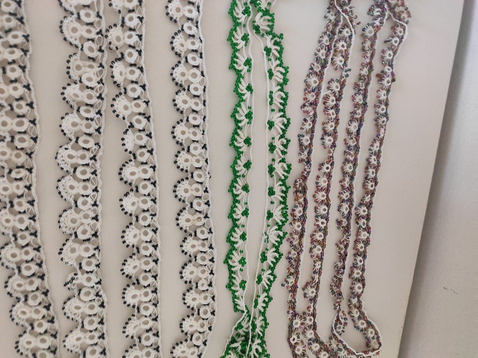 Beyaz, yeşil ve çok renkli çiçek desenli bohem tarzda narin dantel şeritler.
