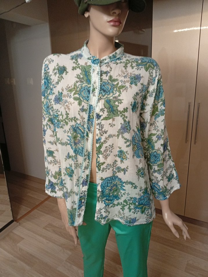 Bohem tarzda, düğmeli, uzun kollu ve yüksek yakalı, gevşek kesim kadın gömleği. Yumuşak tekstil kumaş, pastel turkuaz çiçek desenlidir.
