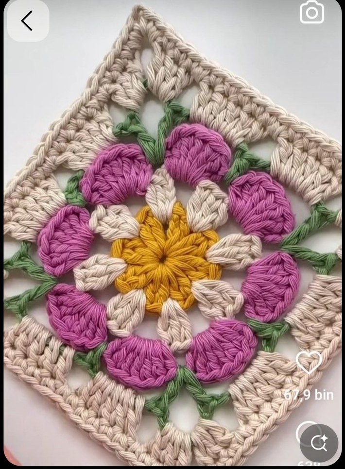 Bohem tarzda, sarı, pembe ve yeşil iplerle bej zemin üzerinde çiçek desenli el örgüsü motif .