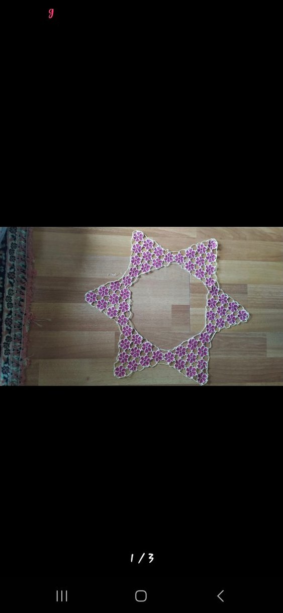 Mor ve krem renklerde çiçek desenli, bohem tarzda el yapımı dekoratif örgü parça. İç mekanlara özgünlük katar.