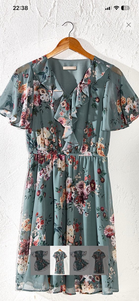 Turkuaz renkte, V yaka ve kısa kollu, bol kesim çiçek desenli elbise. Fırfır detayları ve yumuşak sentetik kumaşıyla günlük kullanıma uygundur.