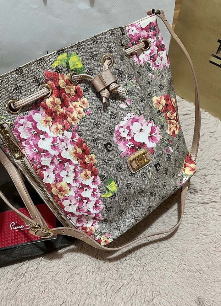 Canlı çiçek desenli, sentetik kumaştan yapılmış, tokalı gri kadın çantası. Günlük kullanıma uygun bohem tarzda.