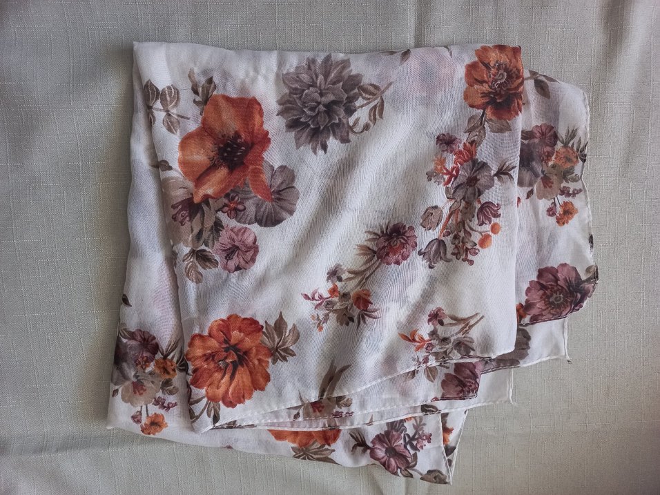 Bohem tarzda, gri ve beyaz tonlarda çiçek desenli, dökümlü kadın şalı. Yumuşak sentetik kumaştan üretilmiştir.