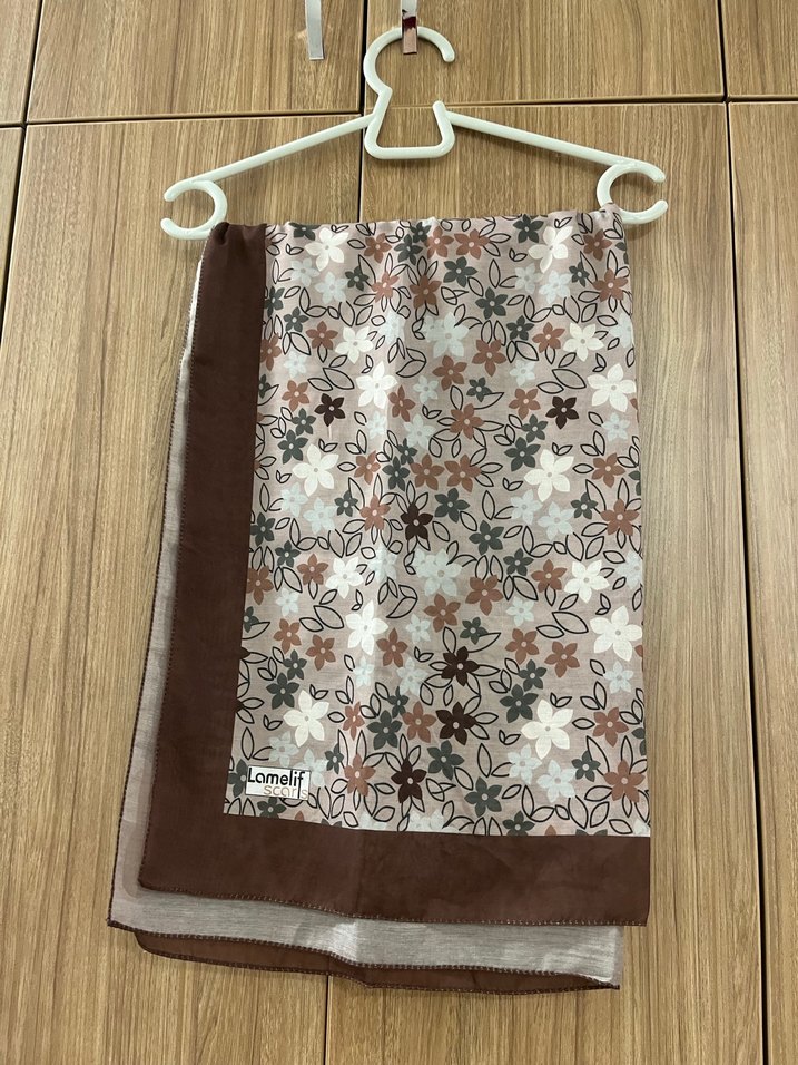 Bohem tarzda, çiçek desenli, kahverengi ve gri renklerde, sentetik kumaştan, drapeli kadın şalı.