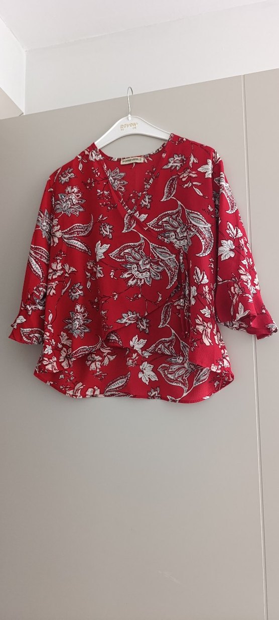 Rahat kesim, uzun kollu ve V yakalı, renkli çiçek desenli, fırfır detaylı bluz. Yumuşak sentetik kumaştan, günlük kullanım için uygun.