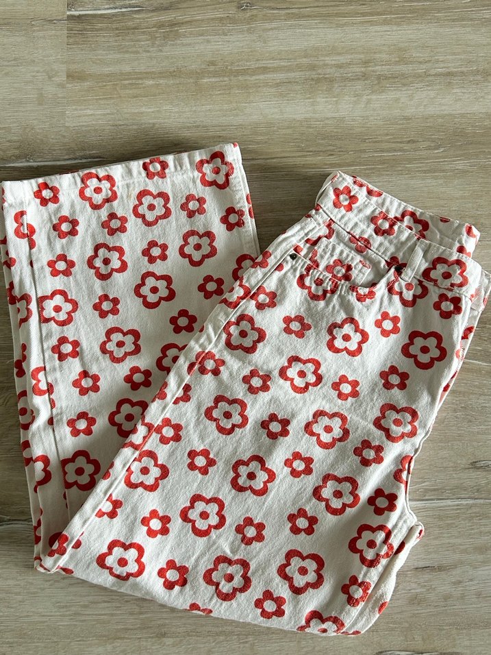 Yumuşak tekstil kumaştan, kırmızı çiçek desenli bol kesim midi kot pantolon. Düğmeli ve bohem tarzda, günlük kullanıma uygun.