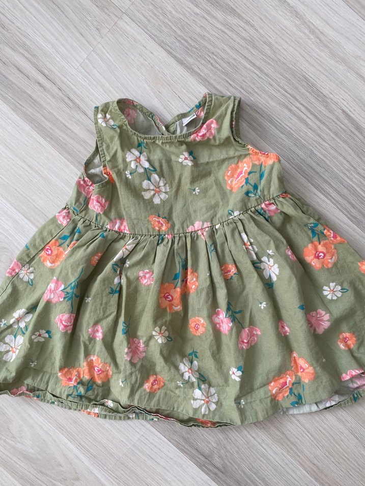 Bohem tarzı, pastel haki renkli, çiçek desenli, kolsuz ve bol kesim kız elbisesi, fırfır detaylı.