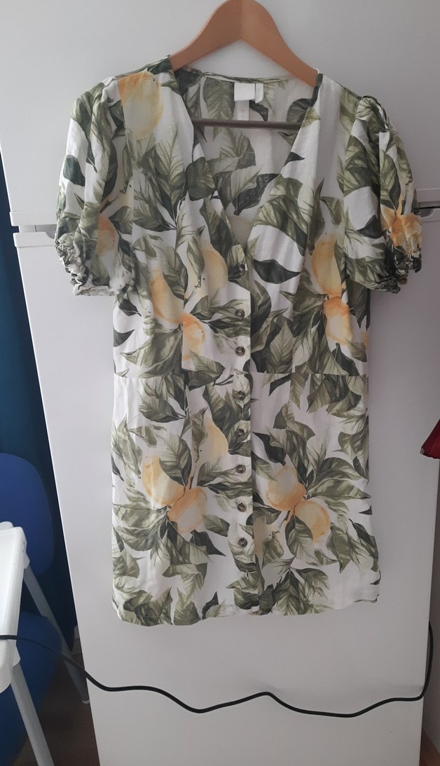 Bol kesim, kısa kollu, V yaka ve düğmeli midi elbise. Yumuşak sentetik kumaş, pastel çiçek desenli bohem tarzı.