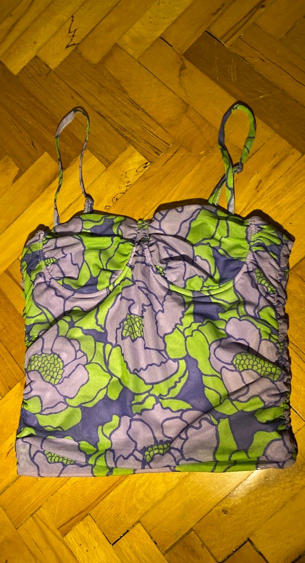Mor ve gri canlı çiçek desenli, straplez yaka ve fermuarlı sırt detaylı, vücuda oturan mini büstiyer. Retro bohem tarzıyla dış mekanlar için uygun.